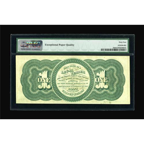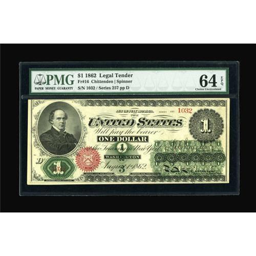 <B>Fr. 16 $1 1862 Legal Tender PMG Choice Uncirculated 64 EPQ.</B></I> Here is yet another screaming original note from this phenomenal collection. Plenty of embossing remains though the frame line is cut-into along the top margin at left.<B><BR></B></I><I>From The John Ameen Collection</B></I><BR><BR><b>Shipping:</b> Coins & Currency (<a target="_blank" href="http://www.heritageauctions.com/common/shipping.php">view shipping information</a>)