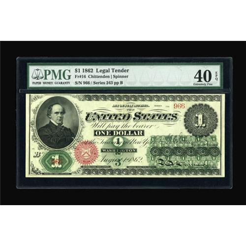 <B>Fr. 16 $1 1862 Legal Tender PMG Extremely Fine 40 EPQ.</B></I> Pleasing three digit serial number 966 graces this original, deeply inked ace.<BR><BR><b>Shipping:</b> Coins & Currency (<a target="_blank" href="http://www.heritageauctions.com/common/shipping.php">view shipping information</a>)