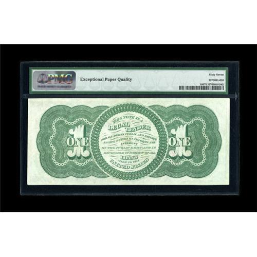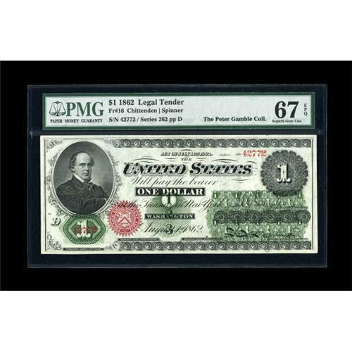 <B>Fr. 16 $1 1862 Legal Tender PMG Superb Gem Unc 67 EPQ.</B></I> The margins and colors of this early Ace are astounding. This note is not at all rare, even at the 65 level, but 67 examples are rare in the extreme. This note is the only one PMG has graded at this level--not only for Fr. 16, but for all four Friedberg numbers of this $1 1862 type. While it is likely that this piece will not remain unique in this grade, it is equally sure that it will never be anything but rare. PMG has graded 188 Fr. 16s with nearly half that number Uncirculated, but this is the sole 67 to date. <BR><I>From The Peter Gamble Collection.</B></I><BR><BR><b>Shipping:</b> Coins & Currency (<a target="_blank" href="http://www.heritageauctions.com/common/shipping.php">view shipping information</a>)