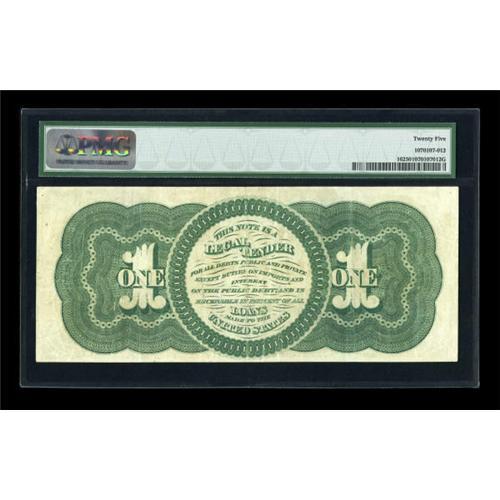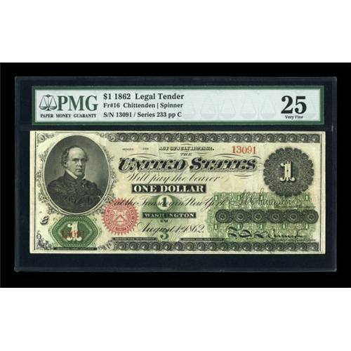 <B>Fr. 16 $1 1862 Legal Tender PMG Very Fine 25.</B></I> The most common by far of the four different Friedberg numbers of 1862 Aces, making it an ideal note to represent the type. It's a perfect collector-grade piece, with a few light folds visible mostly from the back, but with strong color, no soil and great eye appeal.<BR><BR><b>Shipping:</b> Coins & Currency (<a target="_blank" href="http://www.heritageauctions.com/common/shipping.php">view shipping information</a>)