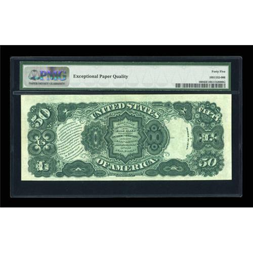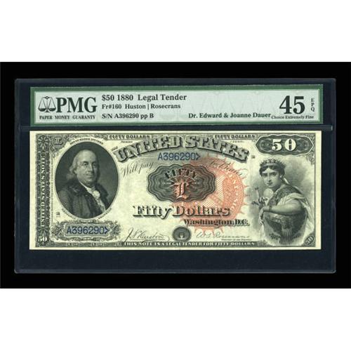 <B>Fr. 160 $50 1880 Legal Tender PMG Extremely Fine 45 EPQ.</B></I> Only sixteen examples of this Friedberg number are listed in the census. PMG has graded five examples, with this 45EPQ being tied with one other for the finest of them. That other PMG 45 holds the record auction price for this Friedberg number. We sold it in April of 2006 for $46,000. The Dauers have used this note as the illustration of its type on page 114 of their fine book. With its high XF grade and coveted EPQ qualifier, we fully expect this note to bring a new record price for this number.<BR><I>From The Dr. Edward & Joanne Dauer Collection</B></I><BR><BR><b>Shipping:</b> Coins & Currency (<a target="_blank" href="http://www.heritageauctions.com/common/shipping.php">view shipping information</a>)