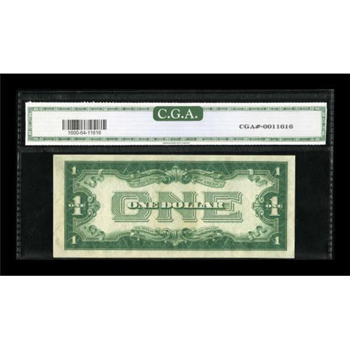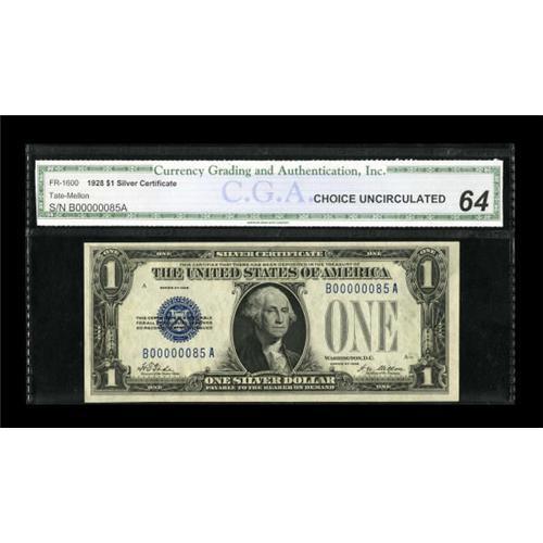 <B>Fr. 1600 $1 1928 Silver Certificate. CGA Choice Uncirculated 64.</B></I><BR> A lovely example bearing double digit serial number B00000085A.<BR><BR><b>Shipping:</b> Coins & Currency (<a target="_blank" href="http://www.heritageauctions.com/common/shipping.php">view shipping information</a>)