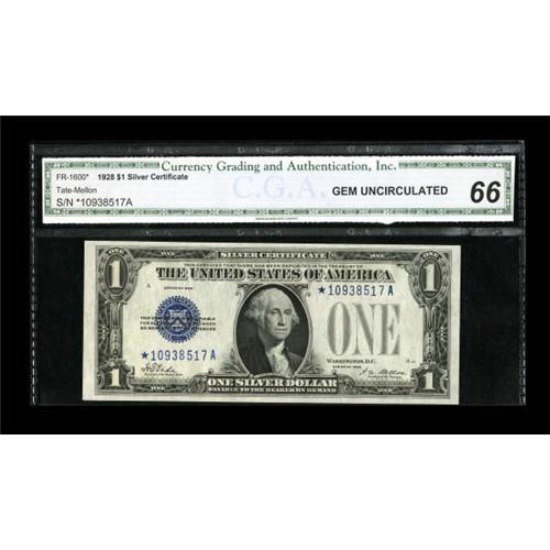 <B>Fr. 1600* $1 1928 Silver Certificate. CGA Gem Uncirculated 66.</B></I><BR> A gorgeous example of the first small Silver replacement note. Bright, fully embossed and nicely centered, it's everything a collector could ask for.<BR><BR><b>Shipping:</b> Coins & Currency (<a target="_blank" href="http://www.heritageauctions.com/common/shipping.php">view shipping information</a>)