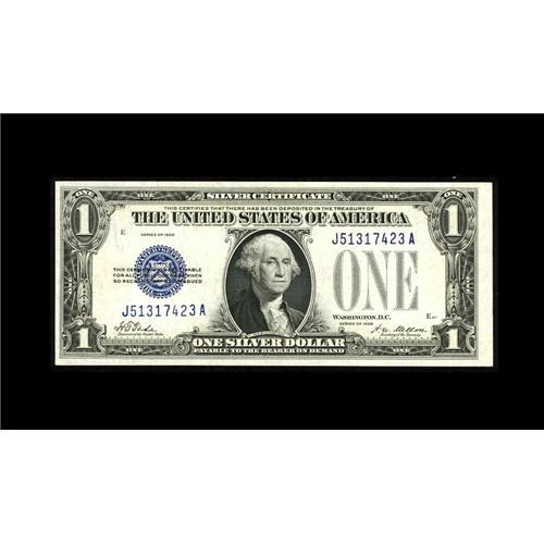 <B>Fr. 1600 $1 1928 Silver Certificate. J-A Block. Crisp Uncirculated+.</B></I><BR>The margins on this new note all a tad off, but the overprints are vivid and the embossing there.