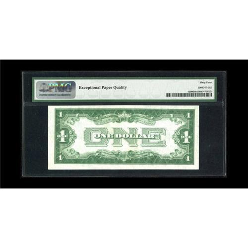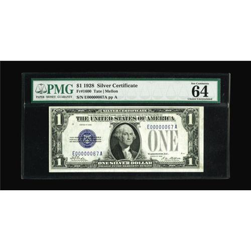 <B>Fr. 1600 $1 1928 Silver Certificate. PMG Choice Uncirculated 64 EPQ.</B></I><BR>This note is adorned with two-digit serial number 67, and PMG has also bestowed "Exceptional Paper Quality".