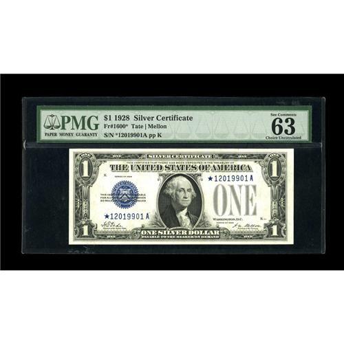 <B>Fr. 1600* $1 1928 Silver Certificate. PMG Choice Uncirculated 63 EPQ.</B></I><BR>The embossing is quite pronounced on this bright replacement ace.<BR><BR><b>Shipping:</b> Coins & Currency (<a target="_blank" href="http://www.heritageauctions.com/common/shipping.php">view shipping information</a>)