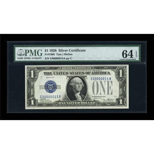 <B>Fr. 1600 $1 1928 Silver Certificate. PMG Choice Uncirculated 64 EPQ.</B></I><BR> Low serial number E00000015A graces this beautiful note that remains fresh and bright.<BR><BR><b>Shipping:</b> Coins & Currency (<a target="_blank" href="http://www.heritageauctions.com/common/shipping.php">view shipping information</a>)