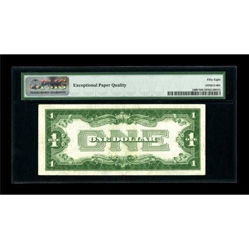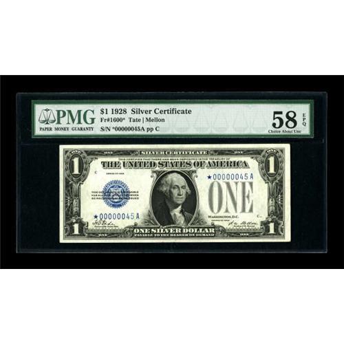 <B>Fr. 1600* $1 1928 Silver Certificate. PMG Choice About Unc 58 EPQ.</B></I><BR> This Star issue is scarce in uncirculated states of preservation. Though this piece shows a faint center fold, it boasts an all appealing two digit serial number 45. A pleasing and wholly original piece with all the eye appeal of a fully margined Gem.<BR><BR><b>Shipping:</b> Coins & Currency (<a target="_blank" href="http://www.heritageauctions.com/common/shipping.php">view shipping information</a>)