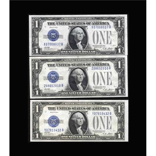 <B>Fr. 1601 $1 1928A Experimental Silver Certificates.</B></I><BR>Three pleasing examples from the X-B, Y-B, and Z-B blocks show perfectly original paper quality. The X-B block shows a soft bend and grades AU, though the other two notes are nothing short of Gem. <B>Choice About Uncirculated to Gem Crisp Uncirculated</B></I>.