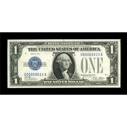 <B>Fr. 1601 $1 1928A Silver Certificate. Choice Crisp Uncirculated.</B></I><BR> Low serial number 10 is seen on this nicely margined U-A block note. <BR><BR><b>Shipping:</b> Coins & Currency (<a target="_blank" href="http://www.heritageauctions.com/common/shipping.php">view shipping information</a>)