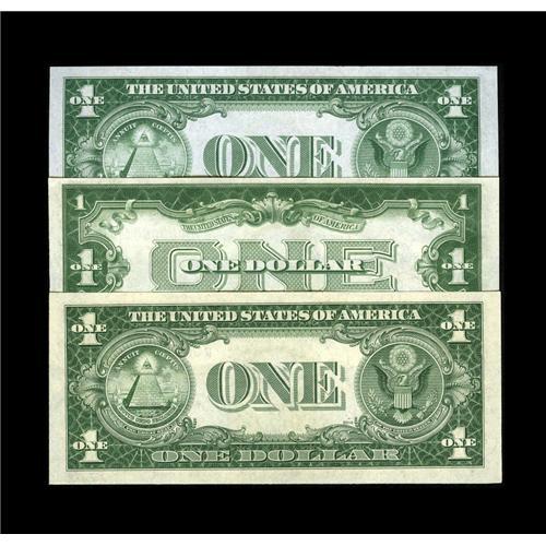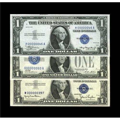 <B>Fr. 1601 $1 1928A Silver Certificate. Crisp Uncirculated,</B></I><BR><B>Fr. 1607 $1 1935 Silver Certificate. CH CU,</B></I><BR><B>Fr. 1613W $1 1935D Silver Certificate. CH CU</B></I><BR>This trio of blue seals all carry two digit serial numbers. The Funnyback is number 60, the 1935 is number 46, and the 1935D Wide is number 39. The notes are all fresh and well embossed.