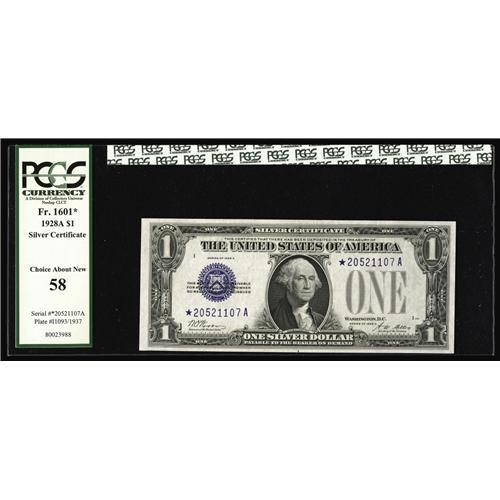 <B>Fr. 1601* $1 1928A Silver Certificate. PCGS Choice About New 58.</B></I><BR>This is a very well centered example of this popular replacement note with vibrant azure overprints.