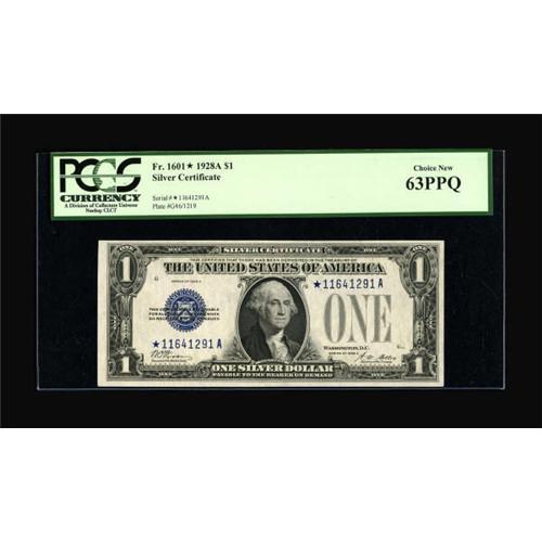 <B>Fr. 1601* $1 1928A Silver Certificate. PCGS Choice New 63PPQ.</B></I><BR> Bright paper and bold embossing add to the appeal of this original and scarce star note.<BR><BR><b>Shipping:</b> Coins & Currency (<a target="_blank" href="http://www.heritageauctions.com/common/shipping.php">view shipping information</a>)