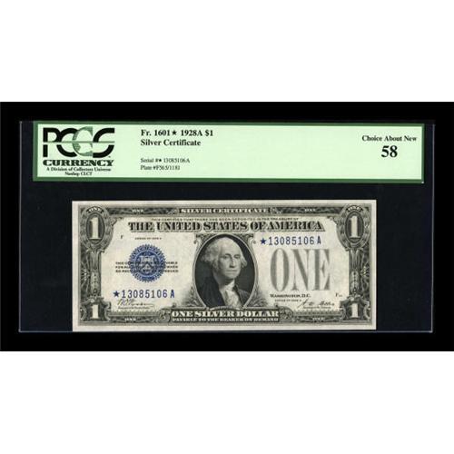 <B>Fr. 1601* $1 1928A Silver Certificate. PCGS Choice About New 58.</B></I><BR> The centering is decent on this early replacement.<BR><I>From The Drew Keough Collection</B></I><BR><BR><b>Shipping:</b> Coins & Currency (<a target="_blank" href="http://www.heritageauctions.com/common/shipping.php">view shipping information</a>)