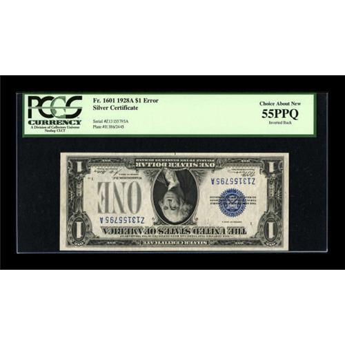<B>Fr. 1601 $1 1928A Silver Certificate. PCGS Choice About New 55PPQ.</B></I><BR> Plenty of embossing is still seen on this inverted back ace that was put away after a brief sojourn in commerce.<BR><I>From The Amelia Island Collection.</B></I><BR><BR><b>Shipping:</b> Coins & Currency (<a target="_blank" href="http://www.heritageauctions.com/common/shipping.php">view shipping information</a>)
