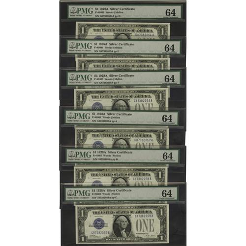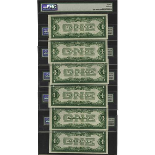 <B>Fr. 1601 $1 1928A Silver Certificates. Six Consecutive Examples. PMG Choice Uncirculated 64.</B></I><BR> This mini-run of notes is from the same pack as the lot of seven below.<BR><BR><b>Shipping:</b> Coins & Currency (<a target="_blank" href="http://www.heritageauctions.com/common/shipping.php">view shipping information</a>)