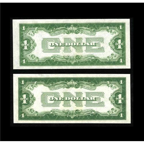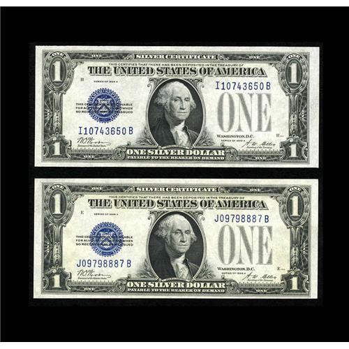 <B>Fr. 1601 $1 1928A Silver Certificates. Two examples. Choice-Gem CU.</B></I><BR>Here are the two keys to this series, the I-B block and the J-B block. These notes are well margined and deeply embossed.<BR>