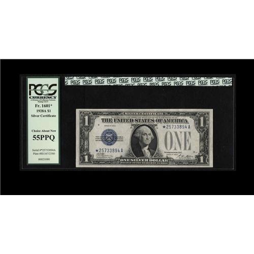 <B>Fr. 1601* $1 1928A Silver Star Certificate. PCGS Choice About New 55PPQ.</B></I><BR>Here is a well balanced example of this replacement note which is quite common in the lower grades.