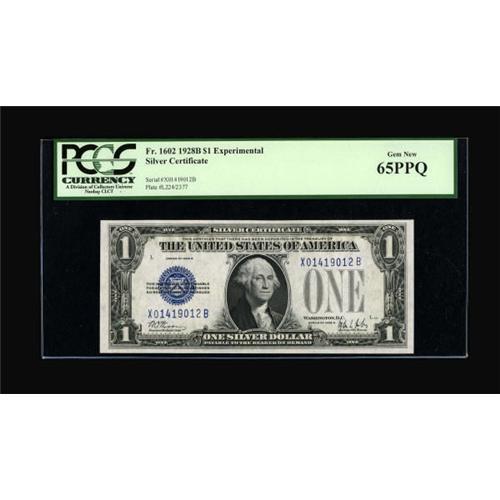 <B>Fr. 1602 $1 1928B Silver Certificate. PCGS Gem New 65PPQ.</B></I><BR> Solid margins all around this original note add to the appeal of the experimental X-B block.<BR><BR><b>Shipping:</b> Coins & Currency (<a target="_blank" href="http://www.heritageauctions.com/common/shipping.php">view shipping information</a>)
