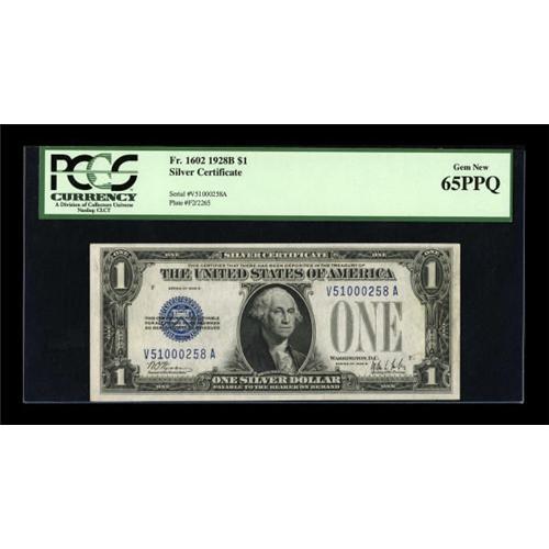 <B>Fr. 1602 $1 1928B Silver Certificate. PCGS Gem New 65PPQ.</B></I><BR> The scarce V-A block is only represented by a few examples and many not of this caliber. Prominent embossing on bright white surfaces makes this note a must have for the advanced small size collector.<BR><I>From The Drew Keough Collection</B></I><BR><BR><b>Shipping:</b> Coins & Currency (<a target="_blank" href="http://www.heritageauctions.com/common/shipping.php">view shipping information</a>)