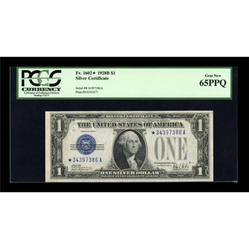 <B>Fr. 1602* $1 1928B Silver Certificate. PCGS Gem New 65PPQ.</B></I><BR> This star has ample margins, embossing, and natural paper wave crests. This is the highest third-party graded note we have had on this Friedberg number.<BR><I>From The Drew Keough Collection</B></I><BR><BR><b>Shipping:</b> Coins & Currency (<a target="_blank" href="http://www.heritageauctions.com/common/shipping.php">view shipping information</a>)