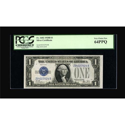 <B>Fr. 1602 $1 1928B Silver Certificate. PCGS Very Choice New 64PPQ</B></I>.<B></B></I><BR> The margins are broad on this near-Gem Z-B experimental block note.<BR><BR><b>Shipping:</b> Coins & Currency (<a target="_blank" href="http://www.heritageauctions.com/common/shipping.php">view shipping information</a>)