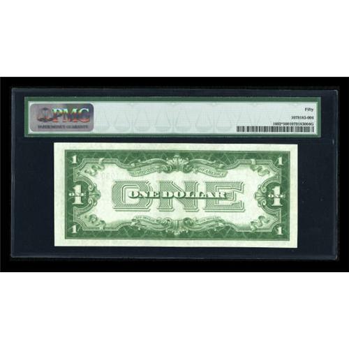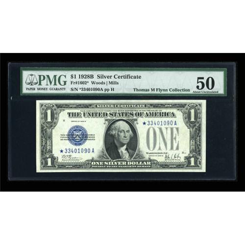 <B>Fr. 1602* $1 1928B Silver Certificate. PMG About Uncirculated 50.</B></I><BR> A tougher star in nice grade, which this is. Well centered and bright.<BR><I>From The Thomas M. Flynn Collection</B></I><BR><BR><b>Shipping:</b> Coins & Currency (<a target="_blank" href="http://www.heritageauctions.com/common/shipping.php">view shipping information</a>)