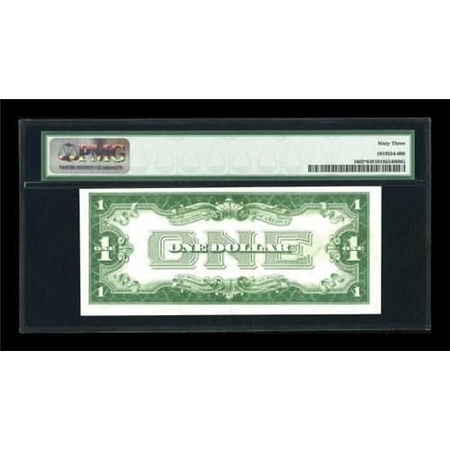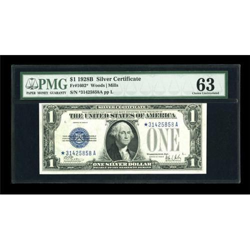 <B>Fr. 1602* $1 1928B Silver Certificate. PMG Choice Uncirculated 63.</B></I><BR> An attractive example of an early blue seal star cut a little tight along the top margin.<BR><BR><b>Shipping:</b> Coins & Currency (<a target="_blank" href="http://www.heritageauctions.com/common/shipping.php">view shipping information</a>)