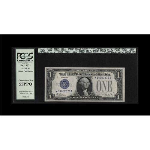 <B>Fr. 1602* $1 1928B Silver Star Certificate. PCGS Choice About New 55PPQ.</B></I><BR>This colorful note suffers from a soft center fold which does not affect the overall desirability.