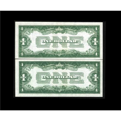 <B>Fr. 1602/1601 $1 1928B/1928A Silver Certificates. Reverse Changeover Pair Choice Crisp Uncirculated.</B></I><BR>The 1928A note is very close cut at the bottom. The new Oakes catalogue values this pair at $450 in Uncirculated and it is listed as well.