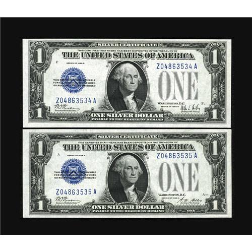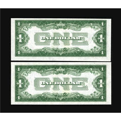 <B>Fr. 1602/1601 $1 1928B/1928A Silver Certificates. Reverse Change Over Pair. Gem Crisp Uncirculated.</B></I><BR>This pair looks like it was just printed this morning. There is not a single Z-A block reverse changeover listed in Oakes.<BR><I>From The Bill and Kathy Stella Currency Collection</B></I><BR><BR><b>Shipping:</b> Coin/Currency (<a target="_blank" href="http://www.heritageauctions.com/common/shipping.php">view shipping information</a>)