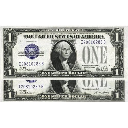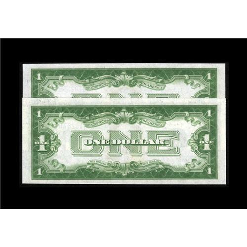 <B>Fr. 1602/Fr. 1601 $1 1928B/1928A Silver Certificates. Reverse Changeover Pair Gem Crisp Uncirculated.</B></I><BR>The 1928B certainly looks Gem while the 1928A is cut a little close at the bottom right margin.