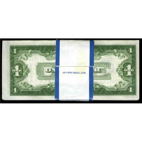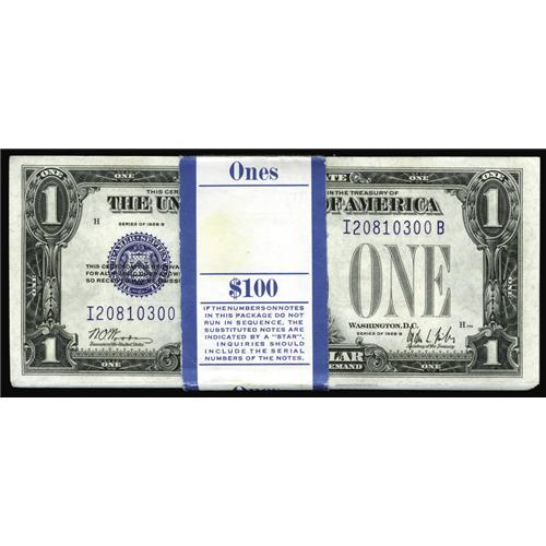 <B>Fr. 1602/Fr.1601 $1 1928B/1928A Silver Certificates. Original Pack 100 Consecutive Examples With 6 Changeover Pairs & 6 Reverse Changeover Pairs Very Choice Crisp Uncirculated.</B></I><BR>This crackling fresh pack comes with not only 100 consecutive $1 Silver Funnybacks, it contains 6 1928B/A reverse changeover pairs and 6 1928A/B changeover pairs. In all there are 36 scarce 1928A I-B and 64 1928B I-B notes. A very unique item with currently only one I-B changeover pair listed in Oakes.<BR>