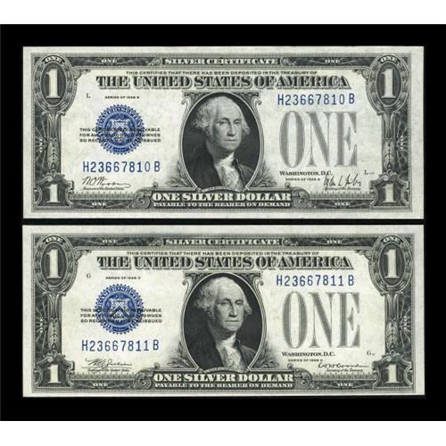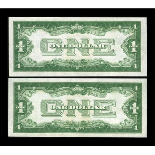 <B>Fr. 1602/Fr. 1604 $1 1928B/1928D Silver Certificates. Changeover Pair Choice/Gem Crisp Uncirculated.</B></I><BR> The Schwartz valuation for this interesting pair is $750 which appears right on. The 1928B is <B>Gem Crisp Uncirculated</B></I> while the 1928D is <B>Choice Crisp Uncirculated.<BR></B></I><I>From The Drew Keough Collection</B></I><BR><BR><b>Shipping:</b> Coins & Currency (<a target="_blank" href="http://www.heritageauctions.com/common/shipping.php">view shipping information</a>)