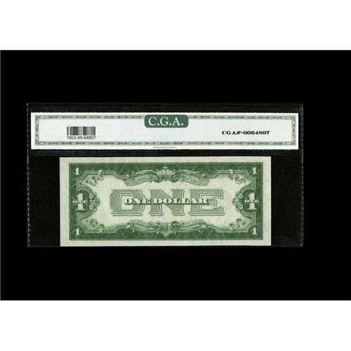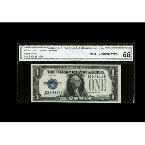 <B>Fr. 1603 $1 1928C Silver Certificate. CGA Gem Uncirculated 66.</B></I><BR>Here is another well-centered example of this scarce issue Silver Ace, which resides in a CGA Gem Uncirculated 66 holder.