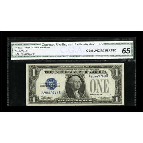 <B>Fr. 1603 $1 1928C Silver Certificate. CGA Gem Uncirculated 65.</B></I><BR> A nicely centered example of this key piece in a CGA 65 holder. <BR><BR><b>Shipping:</b> Coins & Currency (<a target="_blank" href="http://www.heritageauctions.com/common/shipping.php">view shipping information</a>)