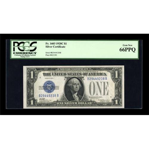 <B>Fr. 1603 $1 1928C Silver Certificate. PCGS Gem New 66PPQ.</B></I><BR> This note hails from the second scarcest series for $1 Silvers. This note is also only 1238 serial numbers away from the beginning of the 1928C Series. The first block for this series is also smaller than all of the other blocks except for the last block. <BR><I>From The Drew Keough Collection</B></I><BR><BR><b>Shipping:</b> Coins & Currency (<a target="_blank" href="http://www.heritageauctions.com/common/shipping.php">view shipping information</a>)