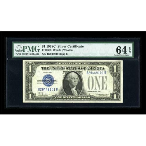 <B>Fr. 1603 $1 1928C Silver Certificate. PMG Choice Uncirculated 64 EPQ.</B></I><BR> The colors are quite fresh and the margins well balanced on this tough note from the B-B block.<BR><I>From The Warren Marshall Collection</B></I><BR><BR><b>Shipping:</b> Coins & Currency (<a target="_blank" href="http://www.heritageauctions.com/common/shipping.php">view shipping information</a>)