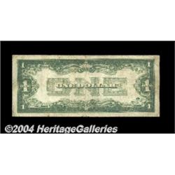 Fr. 1603* $1 1928C Silver Certificate. Very Good.A second example of this rare star, something very seldom seen in any auction and a measure of the strength of the small size offering here. This piece, while well circulated, is problem free but for a short split in the top margin. If rarity is any guide, expect this note to see bidding reach... <BR><BR><B>Important notice:</B> Heritage usually auctions material at the rate of 200-250 lots per hour. On some occasions eBay Live bid software or the Internet may not be able to keep up with the pace of the auction. We recommend placing a realistic absentee bid now as insurance to avoid disappointment. Occasionally the auctioneer may eliminate or reject an eBay Live bid, and the auctioneer may also reopen a lot after the close of the eBay live bidding (usually because we missed an audience bid), and may reject your bid even if it shows you as the winning bidder. By bidding via eBay Live, you agree that Heritage may award the lot to another bidder at its sole discretion under the circumstances described above or any other reasonable circumstances. Since eBay bids are not shown to us until we open the lot on the floor, we treat those bids just like floor bids. In most cases the floor responds before the eBay bid is presented to us, due to Internet lag time, so for consistency we have made it a policy that floor bids are always considered first over tie eBay live bids. Also please note that all Heritage lots purchased through eBay Live carry a 20% Buyer's Premium. Please make sure you read the Terms and Conditions before you bid. <BR><BR><B>IMPORTANT ANNOUNCEMENT ABOUT RESERVES:</B> Heritage now divulges all reserves on its web site 7 days before every auction. If you want to know whether the reserve on this lot has been met, and if not, what the reserve amount is, please visit this lot page on the HeritageCoin.com web site, or email: bid@HeritageGalleries.com