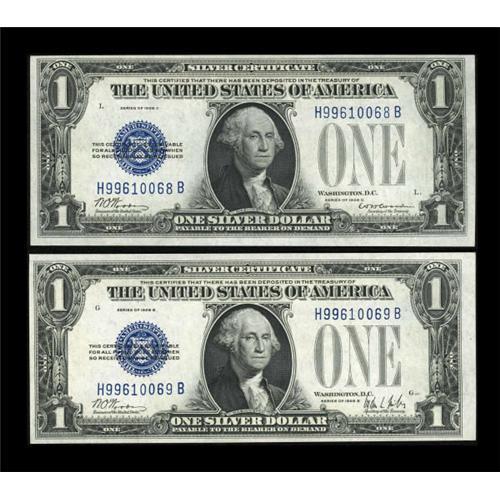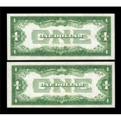 <B>Fr. 1603/Fr. 1602 $1 1928C/1928B Silver Certificates. Reverse Changeover Pair Choice Crisp Uncirculated.</B></I><BR> Only three such pairs are reported in Schwartz/Lindquist along with this pair. Plenty of embossing is noticed on this elusive duo.<B><BR></B></I><I>From The Drew Keough Collection</B></I><BR><BR><b>Shipping:</b> Coins & Currency (<a target="_blank" href="http://www.heritageauctions.com/common/shipping.php">view shipping information</a>)