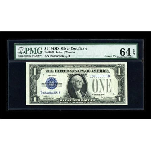 <B>Fr. 1604 $1 1928D Silver Certificate Fancy Serial Number. PMG Choice Uncirculated 64 EPQ.</B></I><BR> A nifty fancy number note which is fully original and enhanced by near solid serial number I08888888B. <BR><BR><b>Shipping:</b> Coins & Currency (<a target="_blank" href="http://www.heritageauctions.com/common/shipping.php">view shipping information</a>)