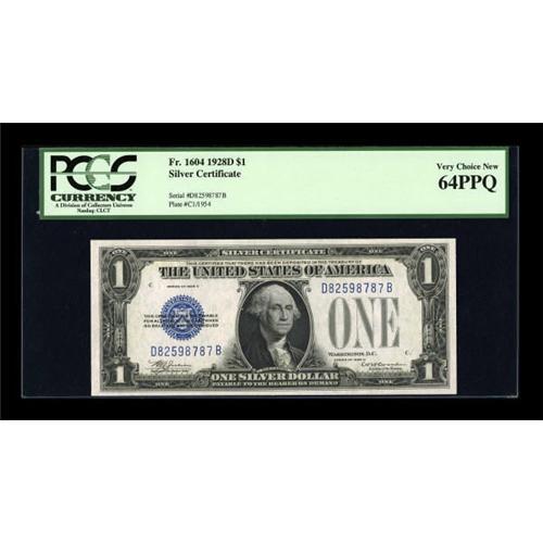 <B>Fr. 1604 $1 1928D Silver Certificate. PCGS Very Choice New 64PPQ.</B></I><BR> Series 1928D is the third rarest series for $1 Silvers. This example is only 2787 serial numbers from the beginning of the first and smallest block for this Friedberg number.<BR><I>From The Drew Keough Collection</B></I><BR><BR><b>Shipping:</b> Coins & Currency (<a target="_blank" href="http://www.heritageauctions.com/common/shipping.php">view shipping information</a>)