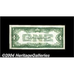 Fr. 1605 $1 1928E Silver Certificate. Gem Crisp Uncirculated.Crackling fresh, fully embossed, and nicely centered for this rare issue. One small handling mark simply attests to this note's complete originality. <BR><BR><B>Important notice:</B> Heritage usually auctions material at the rate of 200-250 lots per hour. On some occasions eBay Live bid software or the Internet may not be able to keep up with the pace of the auction. We recommend placing a realistic absentee bid now as insurance to avoid disappointment. Occasionally the auctioneer may eliminate or reject an eBay Live bid, and the auctioneer may also reopen a lot after the close of the eBay live bidding (usually because we missed an audience bid), and may reject your bid even if it shows you as the winning bidder. By bidding via eBay Live, you agree that Heritage may award the lot to another bidder at its sole discretion under the circumstances described above or any other reasonable circumstances. Since eBay bids are not shown to us until we open the lot on the floor, we treat those bids just like floor bids. In most cases the floor responds before the eBay bid is presented to us, due to Internet lag time, so for consistency we have made it a policy that floor bids are always considered first over tie eBay live bids. Also please note that all Heritage lots purchased through eBay Live carry a 20% Buyer's Premium. Please make sure you read the Terms and Conditions before you bid. <BR><BR><B>IMPORTANT ANNOUNCEMENT ABOUT RESERVES:</B> Heritage now divulges all reserves on its web site 7 days before every auction. If you want to know whether the reserve on this lot has been met, and if not, what the reserve amount is, please visit this lot page on the HeritageCoin.com web site, or email: bid@HeritageGalleries.com