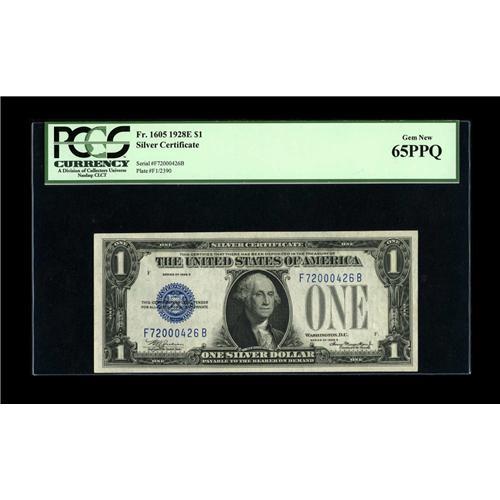 <B>Fr. 1605 $1 1928E Silver Certificate. PCGS Gem New 65PPQ.</B></I><BR>A lovely example of the key to the $1 Silvers which appears to clearly merit its PCGS Gem New 65PPQ designation.<BR><BR><b>Shipping:</b> Coin/Currency (<a target="_blank" href="http://www.heritageauctions.com/common/shipping.php">view shipping information</a>)
