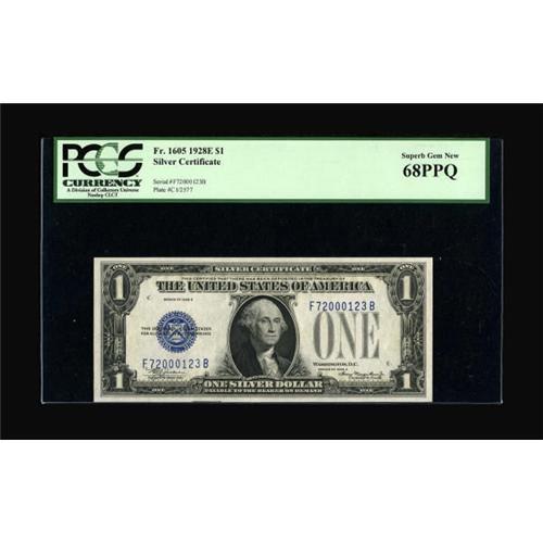 <B>Fr. 1605 $1 1928E Silver Certificate. PCGS Superb Gem New 68PPQ.</B></I><BR> This is a note which approaches perfection, as the centering on both face and back, the brightness of paper and inks, and the originality have earned it the grade of Superb Gem New 68PPQ awarded by PCGS. While PCGS has not released a population report at this writing, PMG has graded 6 1928E ones in 66, two in 67, and none at all in 68. If this were a regular 1928 $1 Silver it would be a rarity in this condition, but to find an example of the key to the $1 Silvers in this state of preservation is simply extraordinary. Any estimate here is mere conjecture, but for those putting together the ultimate Registry Set of $1 Silvers, this note will likely stand unsurpassed for many, many years. <BR><I>From The Drew Keough Collection</B></I><BR><BR><b>Shipping:</b> Coins & Currency (<a target="_blank" href="http://www.heritageauctions.com/common/shipping.php">view shipping information</a>)