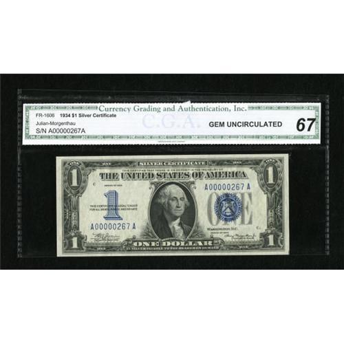 <B>Fr. 1606 $1 1934 Silver Certificate with low #267. CGA Gem Uncirculated 67.</B></I><BR> An abundantly margined and crackling fresh example of this low serial number Funnyback Ace A00000267A.<BR><BR><b>Shipping:</b> Coins & Currency (<a target="_blank" href="http://www.heritageauctions.com/common/shipping.php">view shipping information</a>)