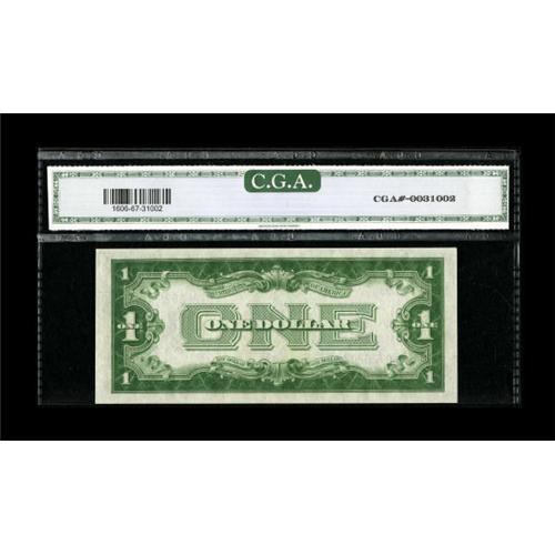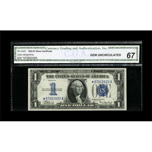 <B>Fr. 1606* $1 1934 Silver Certificate. CGA Gem Uncirculated 67.</B></I><BR> One of the finest replacement notes we have ever offered for this issue. Nice even margins, bright color, and plenty of embossing are seen.<BR><BR><b>Shipping:</b> Coins & Currency (<a target="_blank" href="http://www.heritageauctions.com/common/shipping.php">view shipping information</a>)