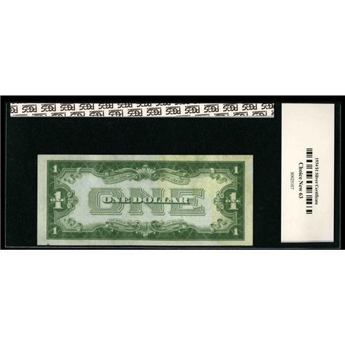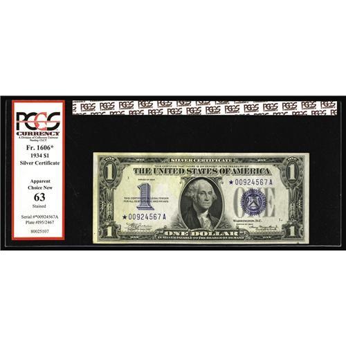 <B>Fr. 1606* $1 1934 Silver Certificate. PCGS Apparent Choice New 63.</B></I><BR>This scarce Star Note has deep embossing and pleasing margins, but has some light yellow staining visible at left which has been noted by PCGS and the reason why it has been red holdered.