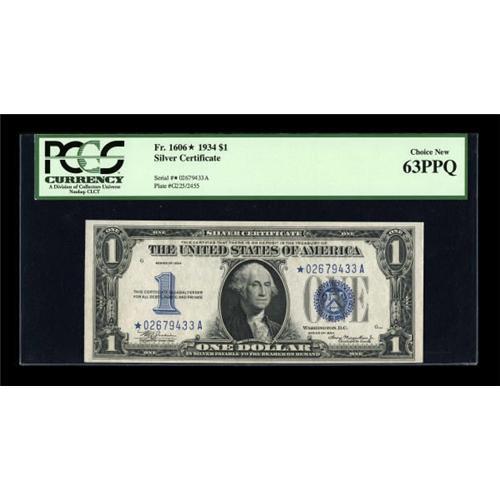 <B>Fr. 1606* $1 1934 Silver Certificate. PCGS Choice New 63PPQ.</B></I><BR> This is an attractive example from this colorful issue with the large blue "1" counter. Only the thinness of the bottom margin keeps this note from ascending higher on the grade scale.<BR><I>From The Drew Keough Collection</B></I><BR><BR><b>Shipping:</b> Coins & Currency (<a target="_blank" href="http://www.heritageauctions.com/common/shipping.php">view shipping information</a>)