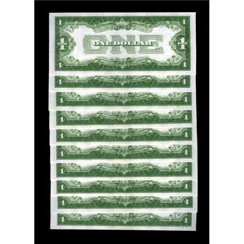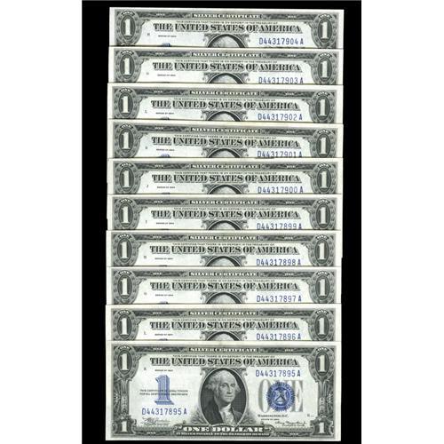 <B>Fr. 1606 $1 1934 Silver Certificates. Ten Consecutive Examples. Crisp Uncirculated.</B></I><BR>These notes all off the D-A block exhibit in your face embossing and vivid inking, but have a little pinch spot at lower left.<BR>